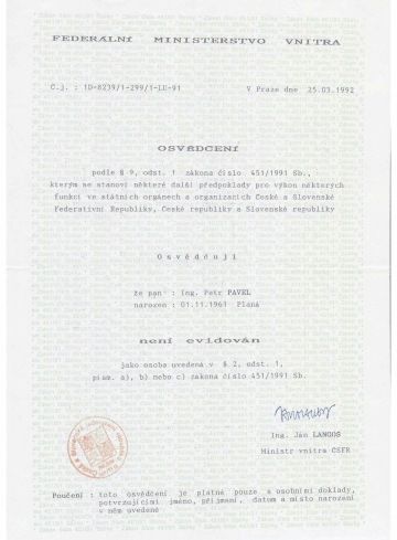 Generál Pavel v minulosti úspěšně prošel nejpřísnějšími českými i světovými bezpečnostními prověrkami. Jak potvrzuje čisté lustrační osvědčení, Petr Pavel nikdy nebyl spolupracovníkem Vojenské kontrarozvědky, ani jiné složky StB.